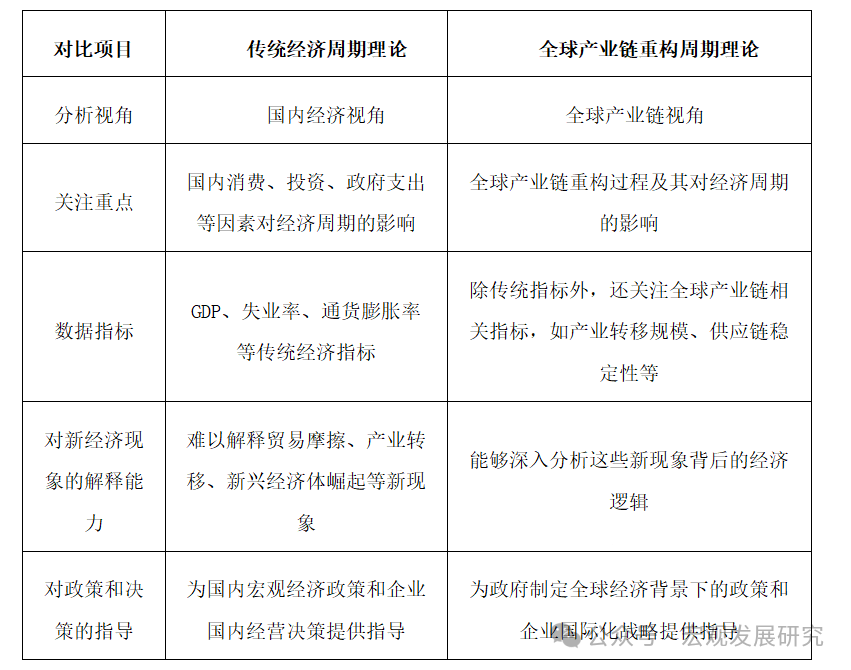 (1)供给新的经济周期阐发视角。全球财产链沉构周期理论打破了保守经济周期理论从国内经济视角阐发周期的局限,从全球财产链的宏不雅层面经济周期波动的缘由和纪律(见表1)。保守理论次要关心国内的消费、投资、收入等要素对经济周期的影响,而轻忽了全球财产链正在经济运转中的环节感化。新理论强调全球财产链的沉构过程若何激发经济的扩张和收缩,为经济周期研究供给了一个全新的视角。通过度析全球财产链各环节正在分歧国度和地域之间的转移和从头组合,以及由此带来的出产、商业和投资的变化,能够更深切地舆解经济周期的内正在机制。例如,正在全球财产链沉构过程中,财产转移会导致相关国度和地域的就业布局、财产布局发生变化,进而影响经济增加和通货膨缩程度,这些要素彼此感化,配合鞭策经济周期的演变。这种新视角有帮于我们更全面、精确地把握经济周期的变化趋向,为经济预测和政策制定供给更无力的理论支撑。