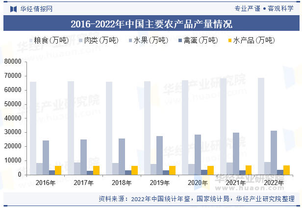 2022年,全国次要农区大部门时段光温水婚配优良,景象形象前提总体有益于粮食做物发展发育和产量构成,但夏日长江流域高温干旱,东北地域南部农田渍涝灾祸偏沉,对粮食出产形成必然影响。按照国度统计年鉴的统计口径,2022年我国粮食实现减产丰收,比上年添加368万吨,减产0。5%,粮食产量持续8年不变正在1。3万亿斤以上。肉类、生果、禽蛋、水产物产量别离为9328。4万吨、31296。2万吨、3456。4万吨、6865。91万吨。