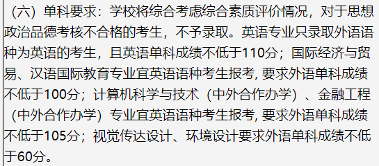 浙江科技大学:英语、德语、国际经济取商业(全英文讲课班)、国际商务(全英文讲课班)四个专业要求外语单科成就不低于110分。