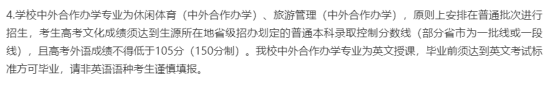 休闲体育、旅逛办理两个中外合做办学专业,外语成就不低于105分,且专业英文讲课,结业前须达到英文测验尺度方可结业。